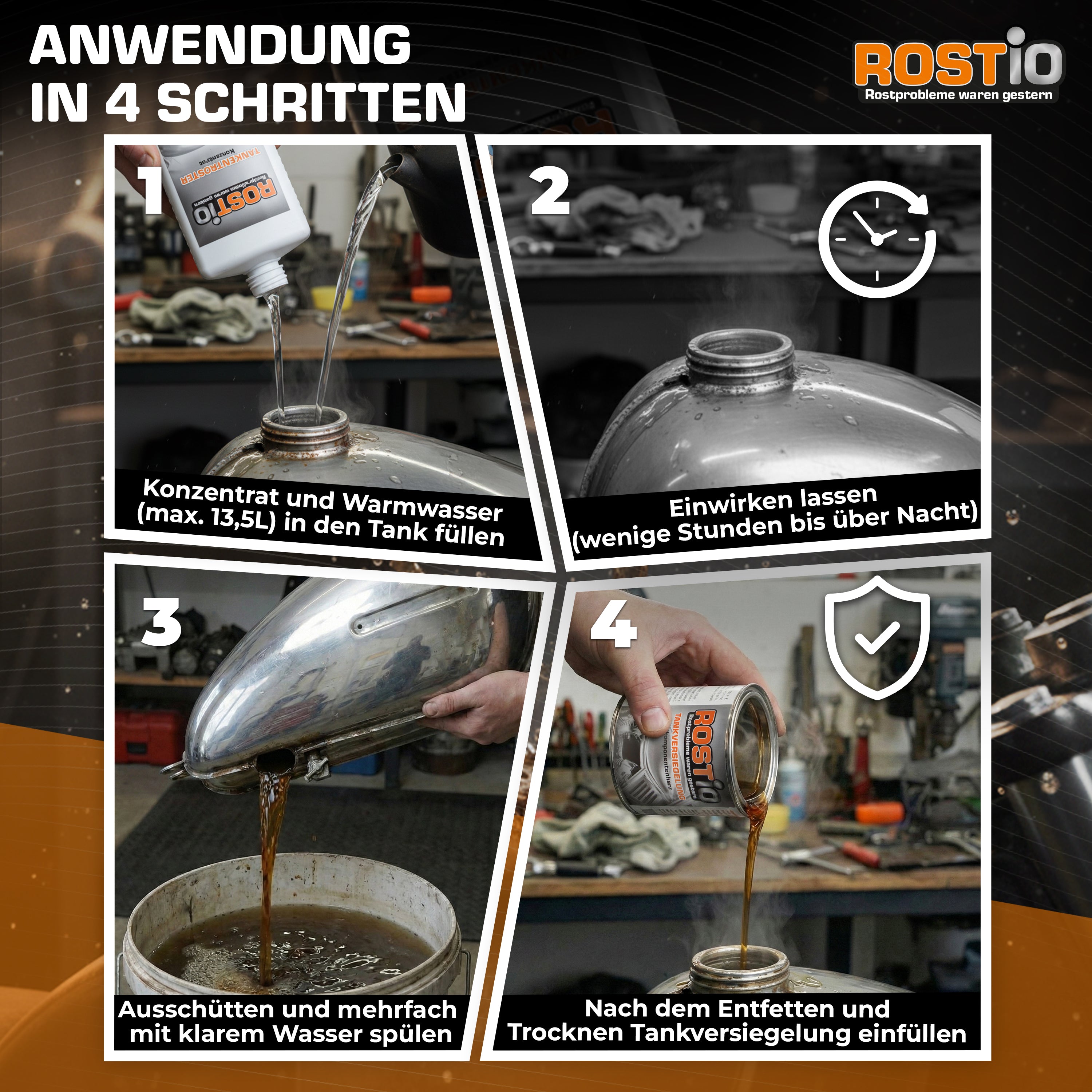 Das ROSTIO Tankentroster Set bietet eine professionelle Lösung zur Entrostung und Versiegelung von Kraftstofftanks aus Stahl und Metall.