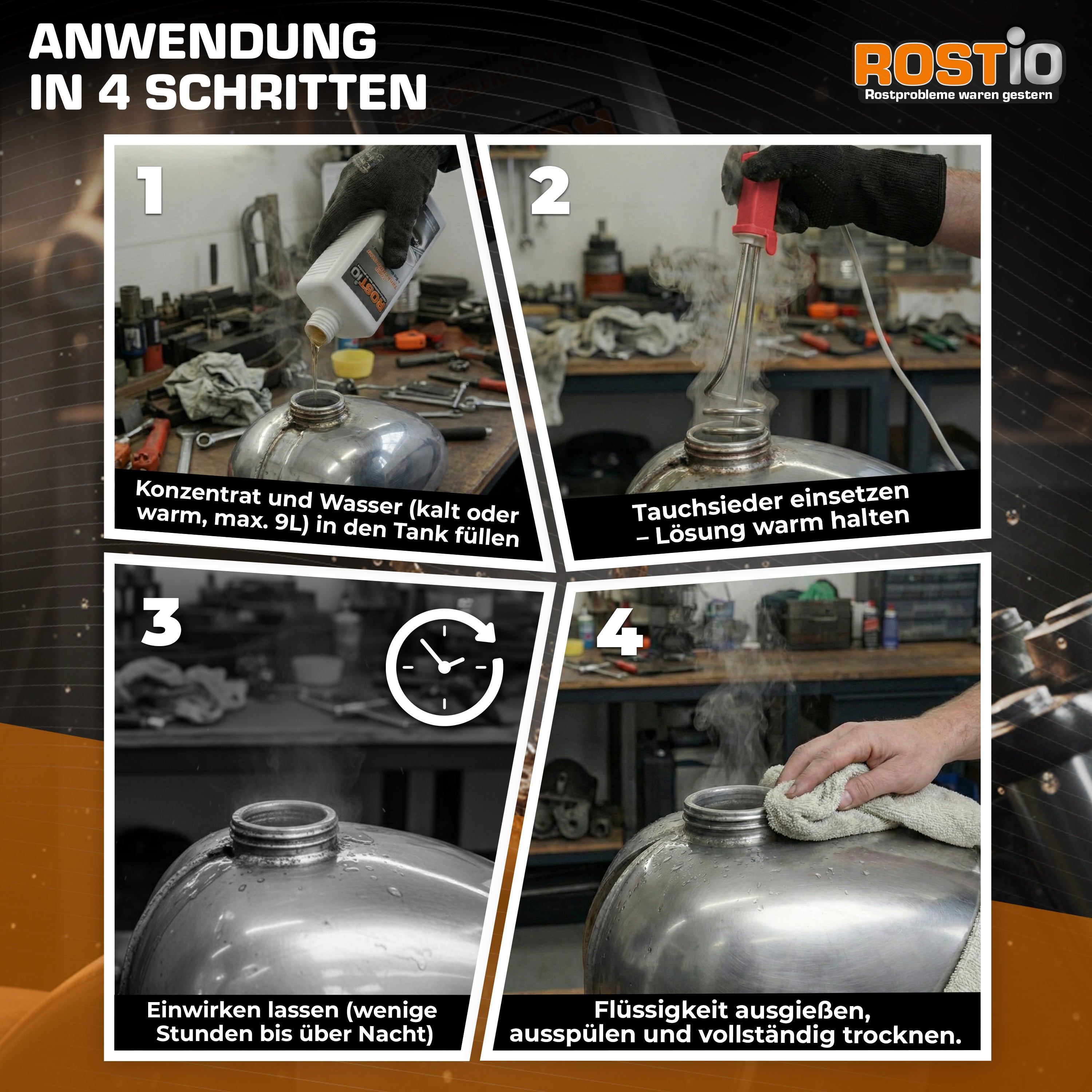 ROSTIO Tankentroster wurde speziell zum Entrosten von Tanks entwickelt und entfernt Rost in Tanks zu 100 %. Der Rost wird im Gegensatz zu einigen anderen Produkten nicht einfach umgewandelt, sondern vollständig und porentief entfernt!
