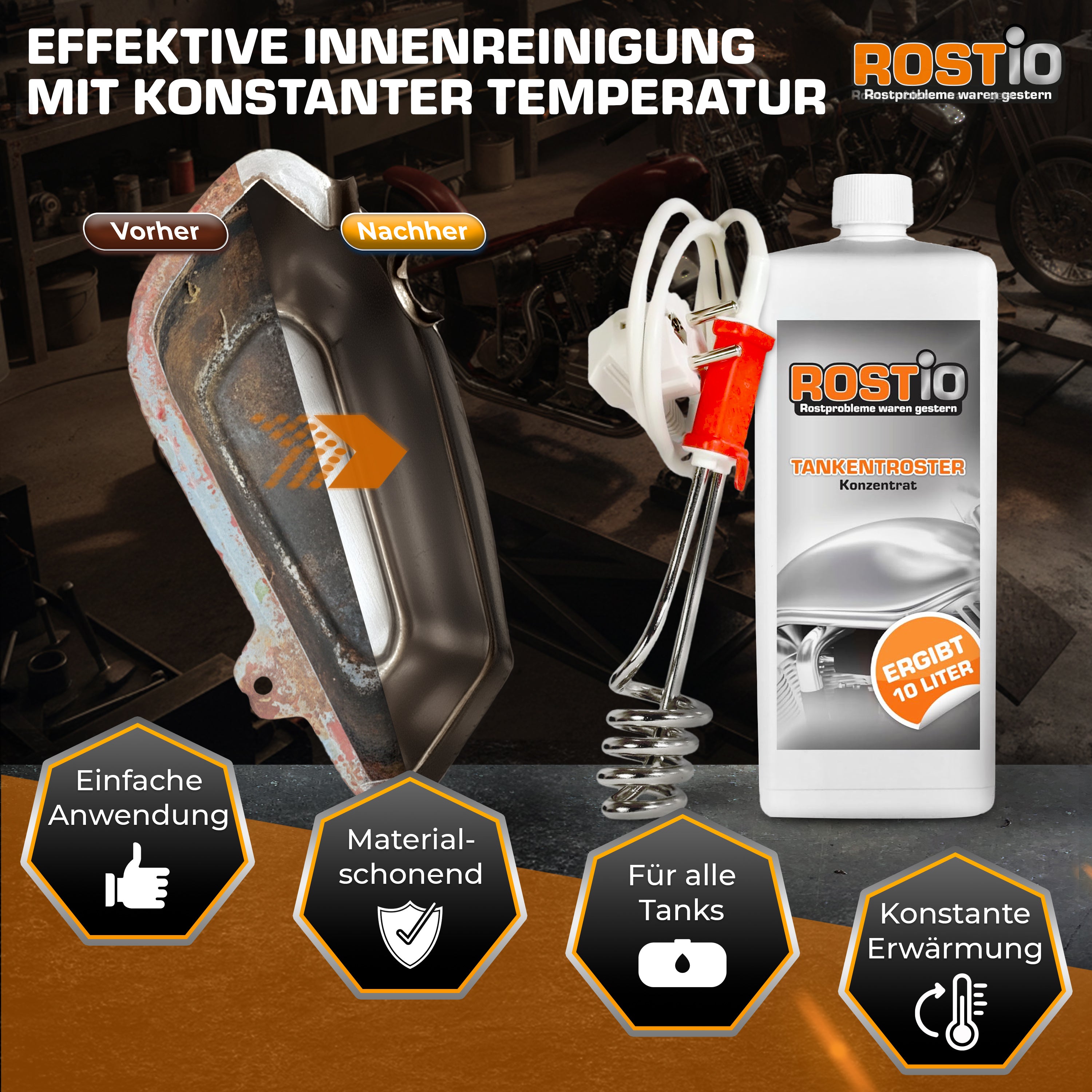 1 Liter ROSTIO Tankentroster Konzentrat inkl. Tauchsieder. Mit dem Tauchsieder kann der ROSTIO Tankentroster im Tank warmgehalten oder direkt erwärmt werden. Besonders zu empfehlen für stark verrostete Tanks oder wenn es schnell gehen soll. Der Tauchsieder hat eine Leistung von 300 Watt, die Heizspirale hat einen Durchmesser von gerade mal 35 mm und passt somit in fast jeden Tank.