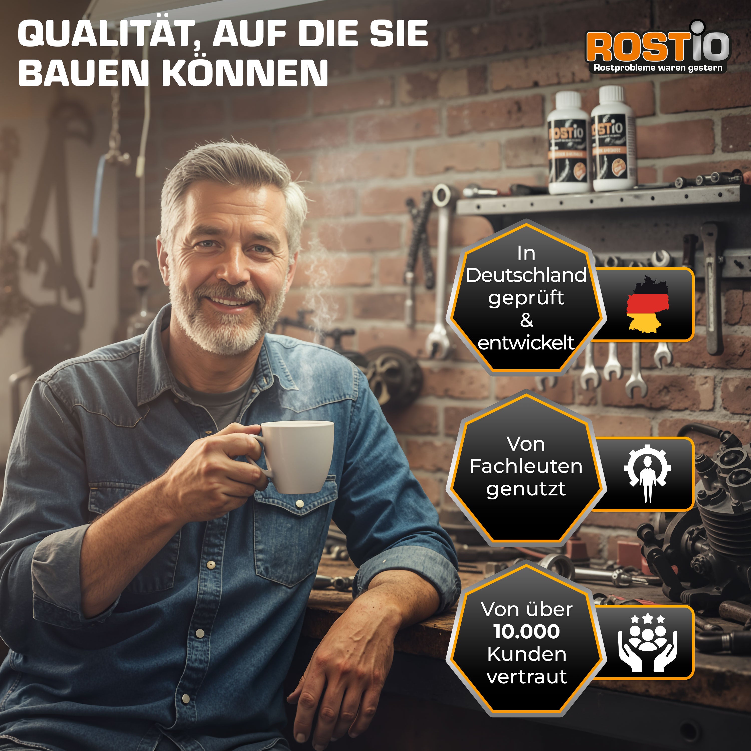 Der ROSTIO Rostumwandler ist die effektive Lösung zur Rostbeseitigung und Roststabilisierung auf Stahloberflächen. Dank seiner innovativen Formel dringt er tief in den Rost ein und wandelt Eisenoxide in eine dauerhafte, blauschwarze, metallorganische Schutzschicht um. So wird der Korrosionsprozess dauerhaft gestoppt und neuer Rost verhindert – ganz ohne mühsames Abspülen.