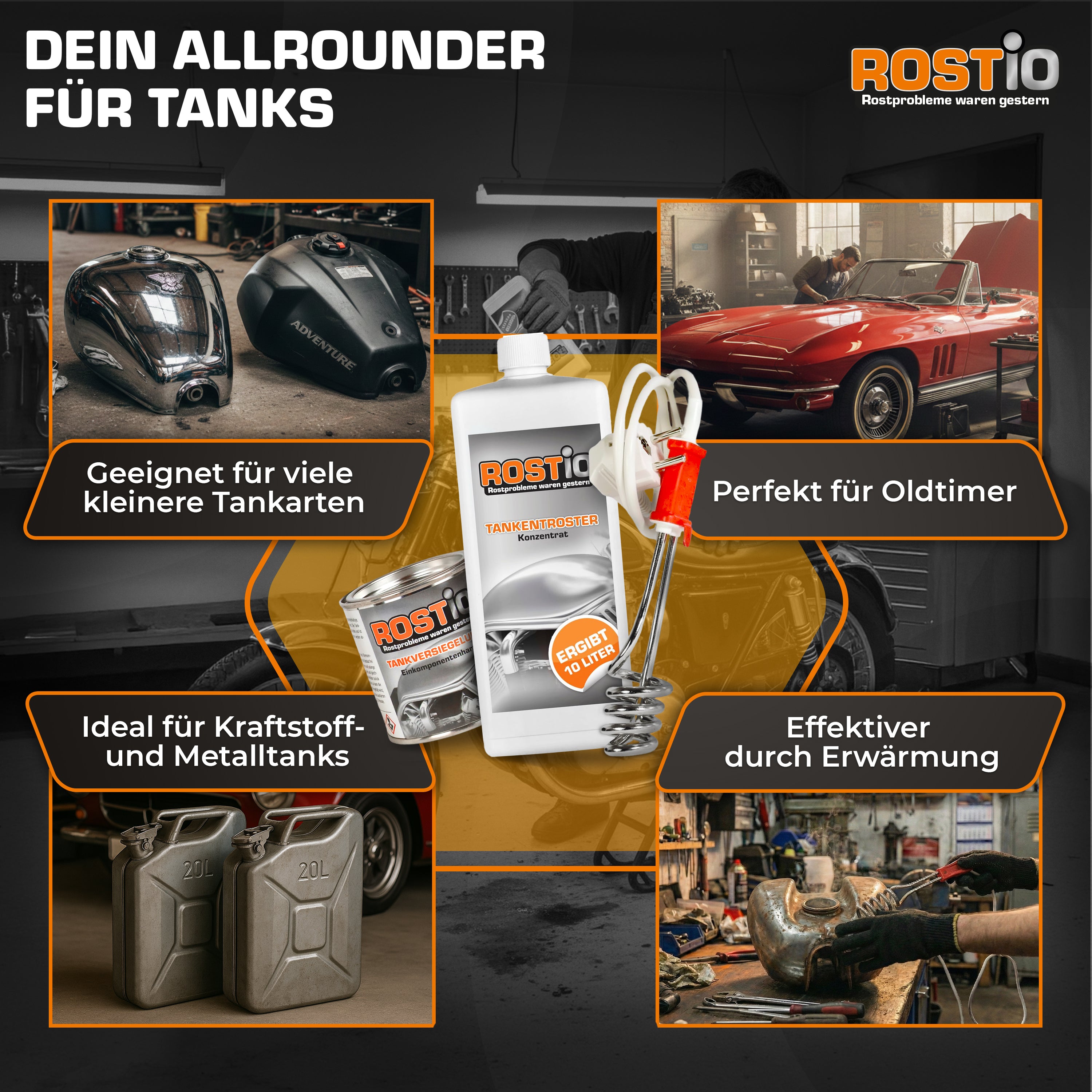Es kombiniert eine gründliche Innenentrostung, eine dauerhafte Tankversiegelung und einen Tauchsieder zur kontrollierten Erwärmung der Entrosterlösung.