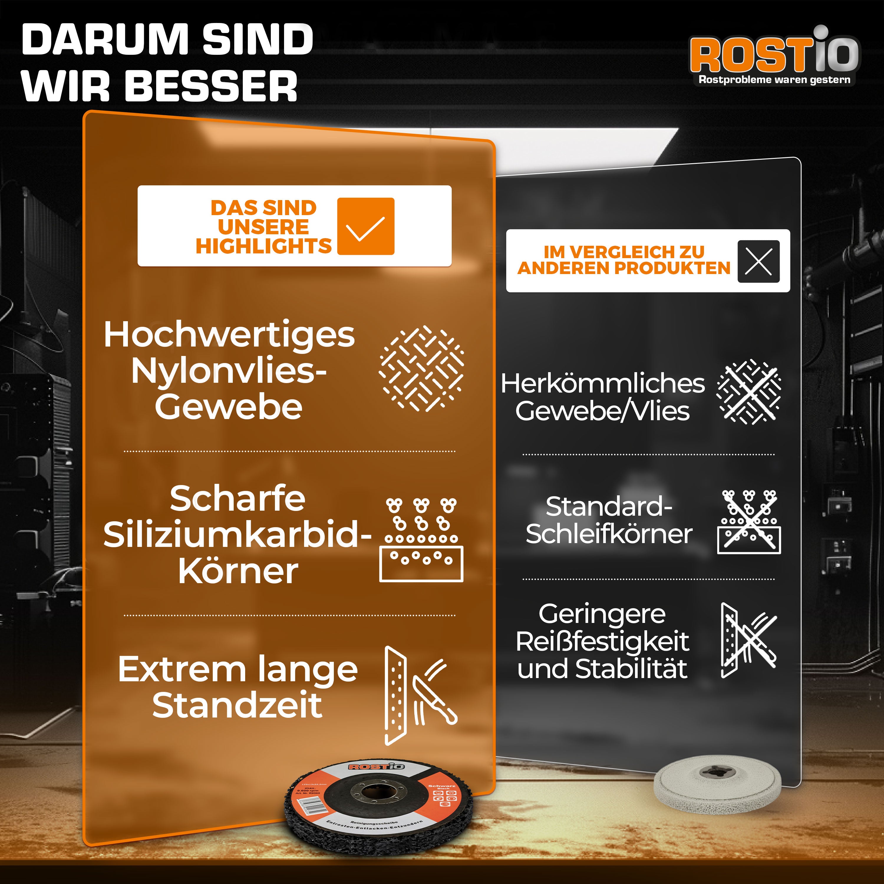 Mit einer CSD Reinigungsscheibe arbeiten Sie im Gegensatz zu anderen Schleifscheiben und Bürsten sehr materialschonend, auf Metall findet so gut wie kein Materialabtrag statt. Beschichtungen wie Lacke, Zunder, Anlauffarben usw. können einfach entfernt werden, ohne dabei gesundes Metall mit abzutragen.